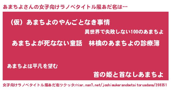 | 男性向けラノベタイトル風あだ名 | 『魔弾の王とあまちよ』『あまちよの憂鬱』 |