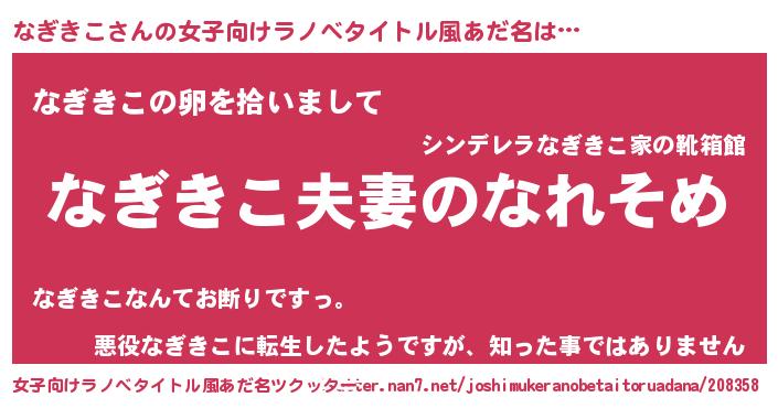 なぎきこさんの女子向けラノベタイトル風あだ名は… 『なぎきこ夫妻のなれそめ』『なぎきこの卵を拾いまして』『悪役なぎきこに転生したようですが、知った事ではありません』 ツクッター #女子向けラノベタイトル風あだ名ツクッター http://tkutter.nan7.net/joshimukeranobetaitoruadana/208358/