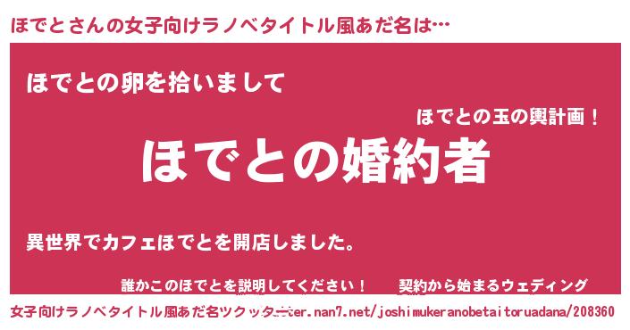ほでとさんの女子向けラノベタイトル風あだ名は… 『ほでとの婚約者』『ほでとの卵を拾いまして』『誰かこのほでとを説明してください! ~契約から始まるウェディング~』 ツクッター #女子向けラノベタイトル風あだ名ツクッター http://tkutter.nan7.net/joshimukeranobetaitoruadana/208360/