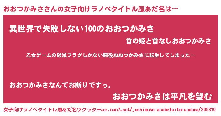 おおつかみささんの女子向けラノベタイトル風あだ名は… 『乙女ゲームの破滅フラグしかない悪役おおつかみさに転生してしまった…』『異世界で失敗しない100のおおつかみさ』『おおつかみさは平凡を望む』 ツクッター #女子向けラノベタイトル風あだ名ツクッター http://tkutter.nan7.net/joshimukeranobetaitoruadana/208370/