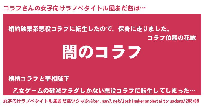 | 男性向けラノベタイトル風あだ名 | 『Re:コラフから始める異世界生活』 |