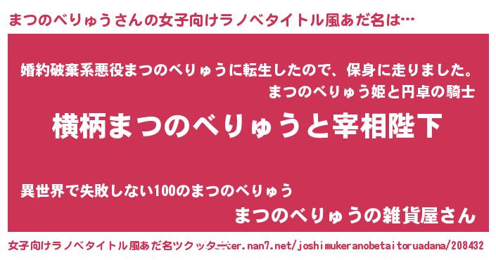 | 男性向けラノベタイトル風あだ名 | 『まつのべりゅうに滅ぼされるだけの簡単なお仕事です』 |