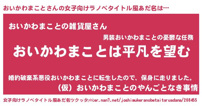 | 胡散臭い通販商品みたいなあだ名 | 『信頼と実績のサプリメント…その名も「おいかわまこと」』 |