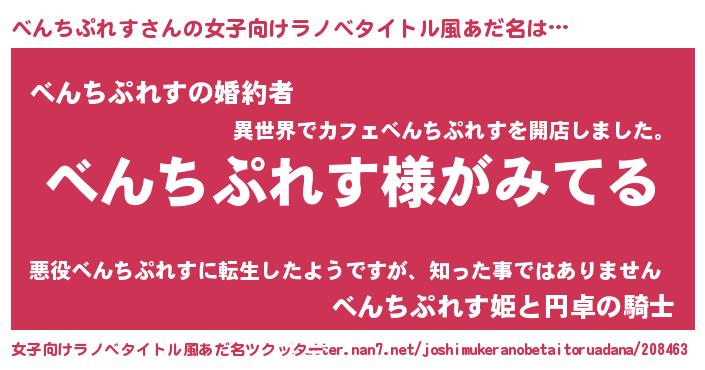 | 男性向けラノベタイトル風あだ名 | 『べんちぷれすの嫁は女の子じゃないと思った?』 |