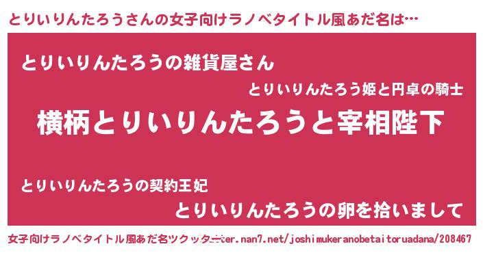 | 男性向けラノベタイトル風あだ名 | 『とりいりんたろうに滅ぼされるだけの簡単なお仕事です』 |