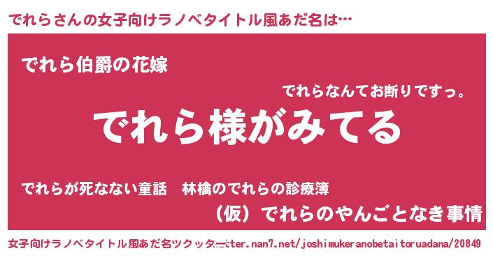 | 男性向けラノベタイトル風あだ名 | 『でれらの嫁は女の子じゃないと思った?』 |