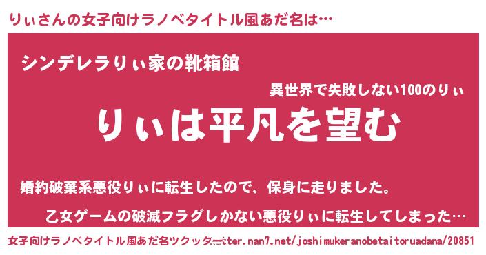 | 男性向けラノベタイトル風あだ名 | 『ダンジョンにりぃを求めるのは間違っているだろうか』 |