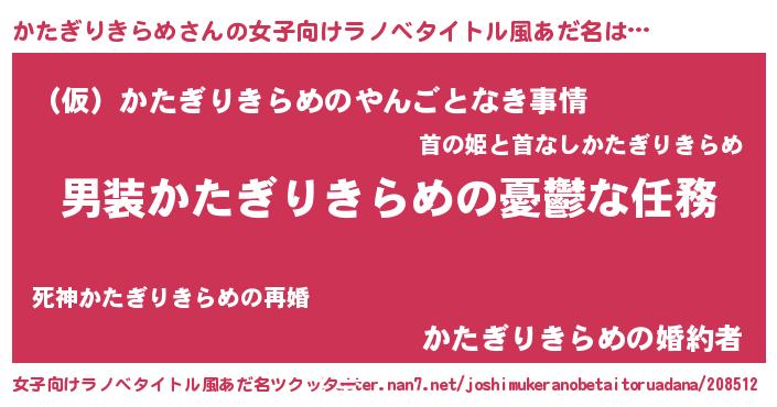 | 男性向けラノベタイトル風あだ名 | 『うちのかたぎりきらめが世界を掌握している!』 |