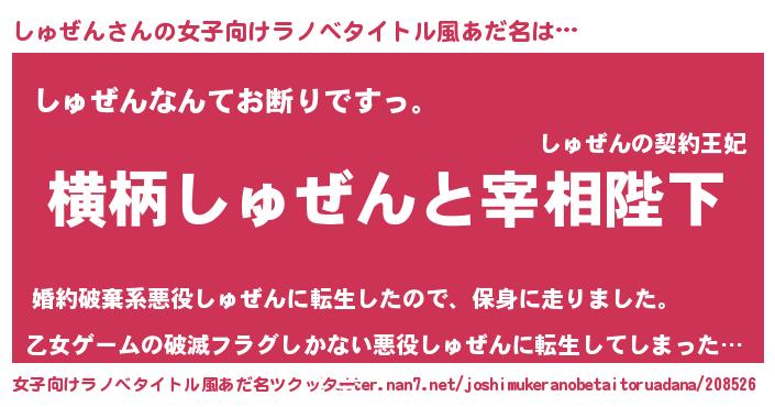 | 男性向けラノベタイトル風あだ名 | 『しゅぜんに滅ぼされるだけの簡単なお仕事です』 |