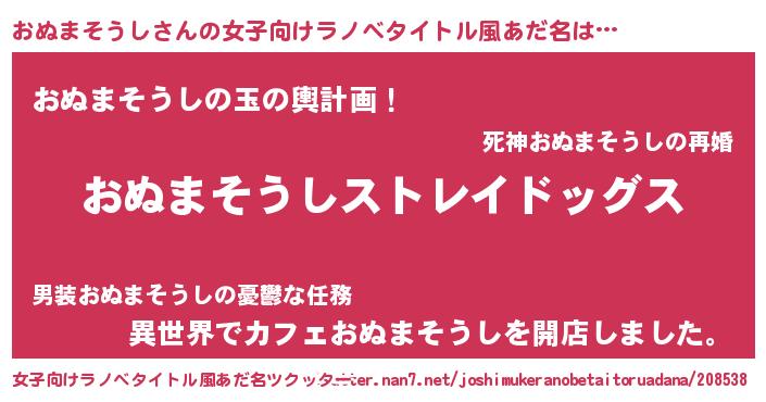 | 男性向けラノベタイトル風あだ名 | 『Re:おぬまそうしから始める異世界生活』 |