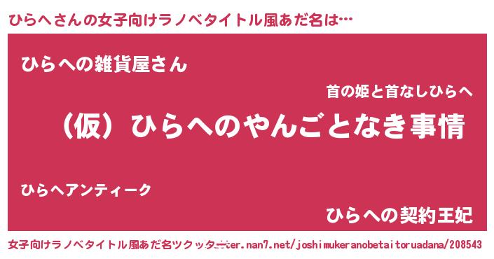 ひらへさんの女子向けラノベタイトル風あだ名は… 『(仮)ひらへのやんごとなき事情』『ひらへの雑貨屋さん』『ひらへの契約王妃』 ツクッター #女子向けラノベタイトル風あだ名ツクッター http://tkutter.nan7.net/joshimukeranobetaitoruadana/208543/