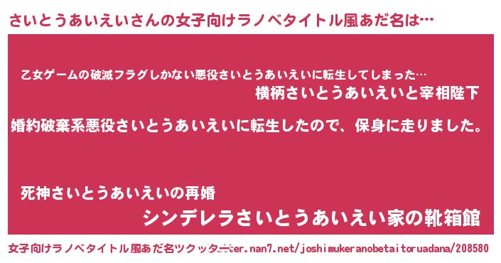 | 胡散臭い通販商品みたいなあだ名 | 『ハリウッド女優が絶賛した100年もののヴィンテージワイン…その名も「さいとうあいえい」』 |