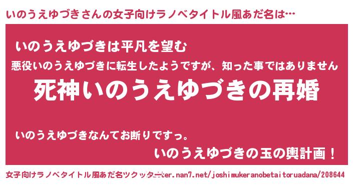 いのうえゆづきさんの女子向けラノベタイトル風あだ名は… 『死神いのうえゆづきの再婚』『いのうえゆづきは平凡を望む』『いのうえゆづきの玉の輿計画!』 ツクッター #女子向けラノベタイトル風あだ名ツクッター http://tkutter.nan7.net/joshimukeranobetaitoruadana/208644/