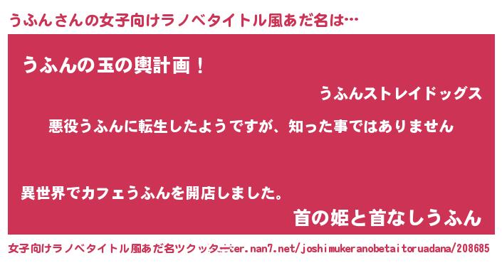 | 男性向けラノベタイトル風あだ名 | 『この素晴らしい世界にうふんを!』 |