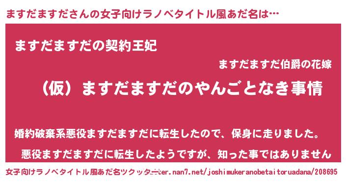 ますだますださんの女子向けラノベタイトル風あだ名は… 『(仮)ますだますだのやんごとなき事情』『ますだますだの契約王妃』『悪役ますだますだに転生したようですが、知った事ではありません』 ツクッター #女子向けラノベタイトル風あだ名ツクッター http://tkutter.nan7.net/joshimukeranobetaitoruadana/208695/