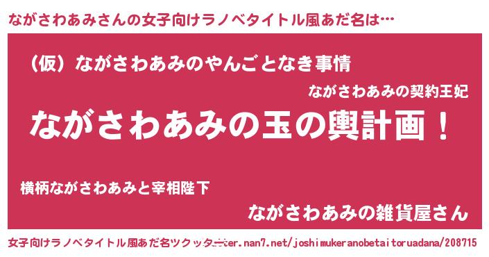 | 男性向けラノベタイトル風あだ名 | 『ながさわあみ~年齢イコール彼女いない歴の魔法使い~』 |