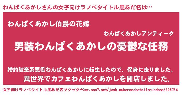 | 男性向けラノベタイトル風あだ名 | 『うちのわんぱくあかしが世界を掌握している!』 |