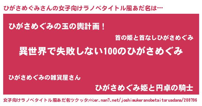 | 男性向けラノベタイトル風あだ名 | 『ひがさめぐみという概念が存在しない退屈な世界 』 |
