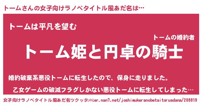 トームさんの女子向けラノベタイトル風あだ名は… 『トーム姫と円卓の騎士』『トームは平凡を望む』『乙女ゲームの破滅フラグしかない悪役トームに転生してしまった…』 ツクッター #女子向けラノベタイトル風あだ名ツクッター http://tkutter.nan7.net/joshimukeranobetaitoruadana/208819/