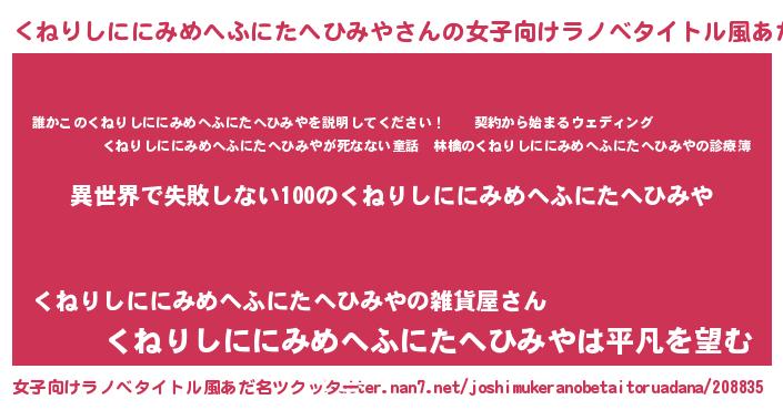 | 男性向けラノベタイトル風あだ名 | 『くねりしににみめへふにたへひみやという概念が存在しない退屈な世界 』 |