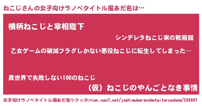 | 男性向けラノベタイトル風あだ名 | 『この素晴らしい世界にねこじを!』 |
