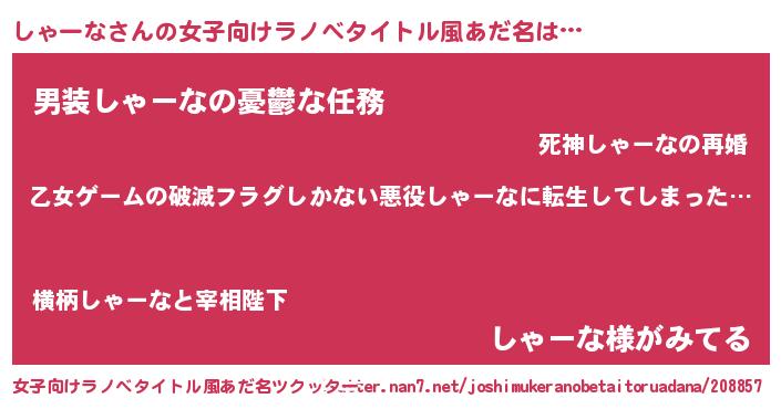 | 男性向けラノベタイトル風あだ名 | 『この素晴らしい世界にしゃーなを!』 |