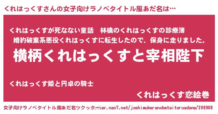 | 男性向けラノベタイトル風あだ名 | 『くれはっくすに滅ぼされるだけの簡単なお仕事です』 |