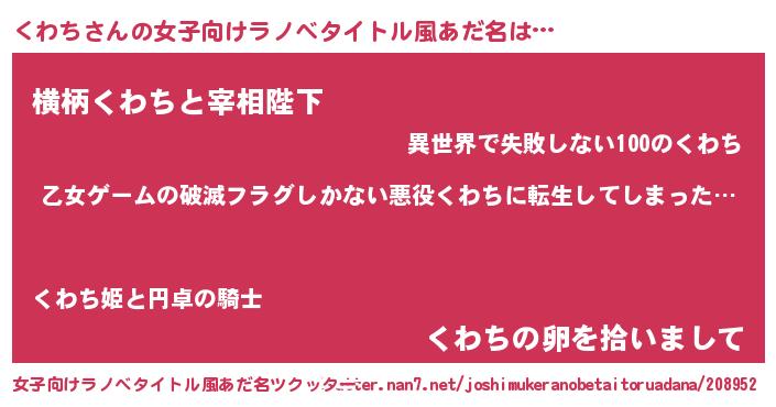 | 男性向けラノベタイトル風あだ名 | 『この素晴らしい世界にくわちを!』 |