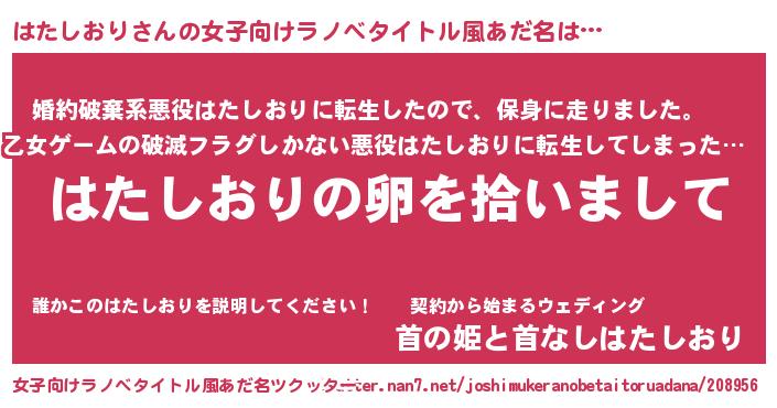 | 男性向けラノベタイトル風あだ名 | 『はたしおりの嫁は女の子じゃないと思った?』 |