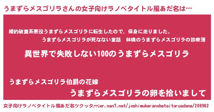 | 男性向けラノベタイトル風あだ名 | 『うまずらメスゴリラという概念が存在しない退屈な世界 』 |