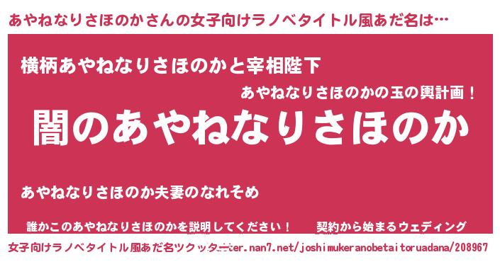 | 男性向けラノベタイトル風あだ名 | 『Re:あやねなりさほのかから始める異世界生活』 |