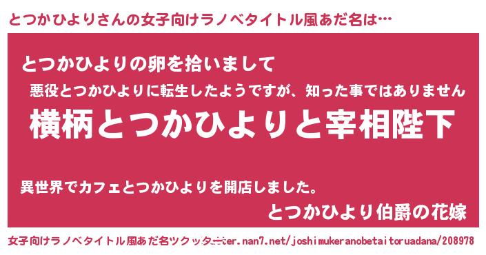 | 男性向けラノベタイトル風あだ名 | 『とつかひよりに滅ぼされるだけの簡単なお仕事です』 |