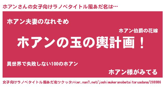 | 男性向けラノベタイトル風あだ名 | 『ホアン~年齢イコール彼女いない歴の魔法使い~』 |