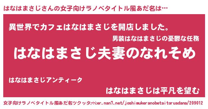 | 男性向けラノベタイトル風あだ名 | 『おまえをオタクにしてやるから、俺をはなはまさじにしてくれ! 』 |