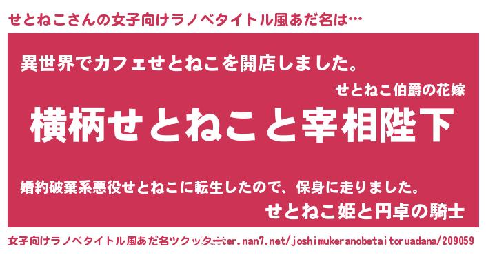 | 男性向けラノベタイトル風あだ名 | 『せとねこに滅ぼされるだけの簡単なお仕事です』 |