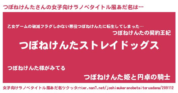| 男性向けラノベタイトル風あだ名 | 『Re:つぼねけんたから始める異世界生活』 |