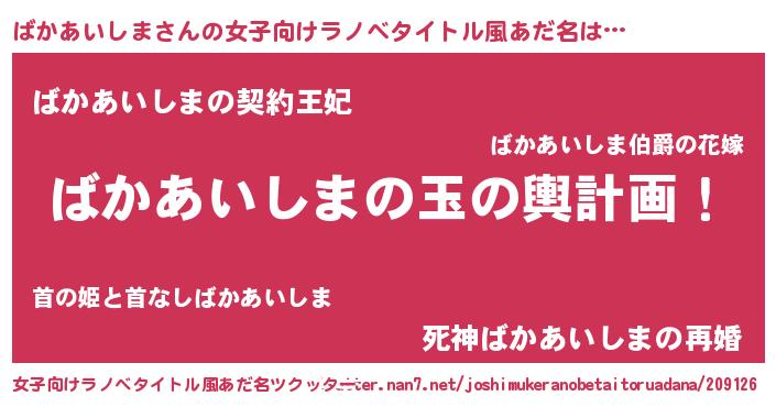 | 男性向けラノベタイトル風あだ名 | 『ばかあいしま~年齢イコール彼女いない歴の魔法使い~』 |