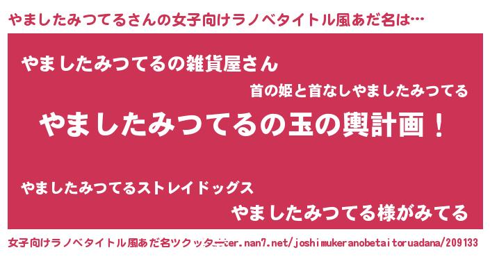 やましたみつてるさんの女子向けラノベタイトル風あだ名は… 『やましたみつてるの玉の輿計画!』『やましたみつてるの雑貨屋さん』『やましたみつてる様がみてる』 ツクッター #女子向けラノベタイトル風あだ名ツクッター http://tkutter.nan7.net/joshimukeranobetaitoruadana/209133/