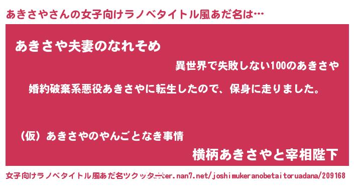 | 料理風あだ名 | 『あきさやごはん』『あきさやのトマト煮』 |