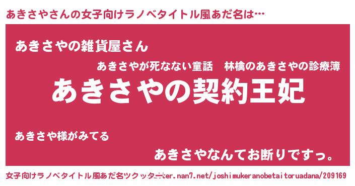 | 男性向けラノベタイトル風あだ名 | 『あきさやという概念が存在しない退屈な世界 』 |