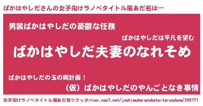 | 男性向けラノベタイトル風あだ名 | 『おまえをオタクにしてやるから、俺をばかはやしだにしてくれ! 』 |