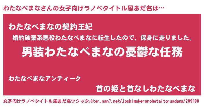 | 男性向けラノベタイトル風あだ名 | 『うちのわたなべまなが世界を掌握している!』 |