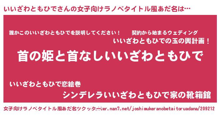 いいざわともひでさんの女子向けラノベタイトル風あだ名は… 『首の姫と首なしいいざわともひで』『誰かこのいいざわともひでを説明してください! ~契約から始まるウェディング~』『シンデレラいいざわともひで家の靴箱館』 ツクッター #女子向けラノベタイトル風あだ名ツクッター http://tkutter.nan7.net/joshimukeranobetaitoruadana/209212/