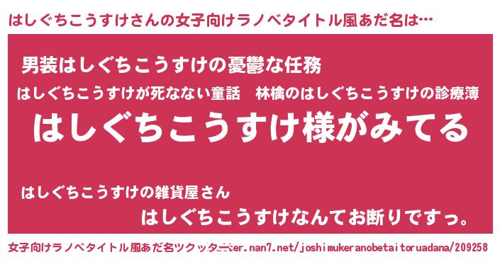 はしぐちこうすけさんの女子向けラノベタイトル風あだ名は… 『はしぐちこうすけ様がみてる』『男装はしぐちこうすけの憂鬱な任務』『はしぐちこうすけなんてお断りですっ。』 ツクッター #女子向けラノベタイトル風あだ名ツクッター http://tkutter.nan7.net/joshimukeranobetaitoruadana/209258/