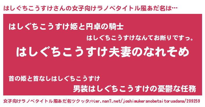 | 男性向けラノベタイトル風あだ名 | 『おまえをオタクにしてやるから、俺をはしぐちこうすけにしてくれ! 』 |