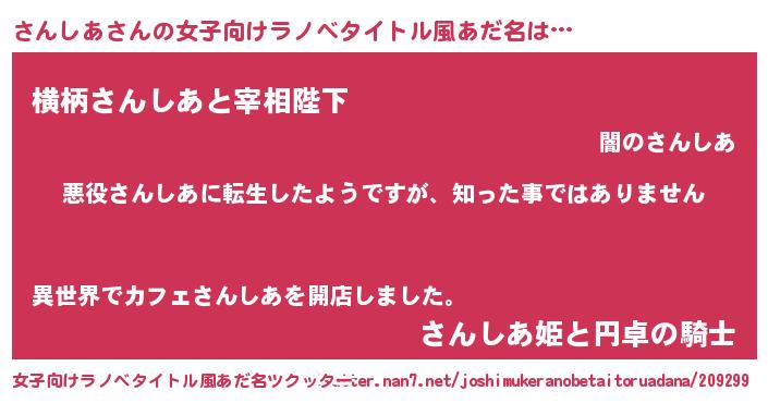 | 男性向けラノベタイトル風あだ名 | 『この素晴らしい世界にさんしあを!』 |