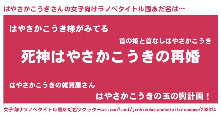 | 男性向けラノベタイトル風あだ名 | 『ノーゲーム・ノーハヤサカコウキ』 |
