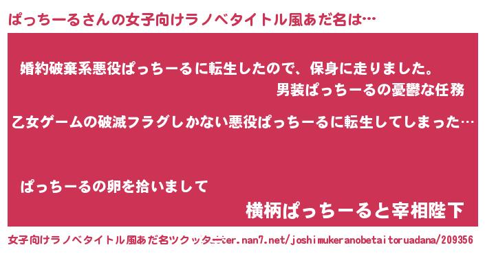| 男性向けラノベタイトル風あだ名 | 『魔弾の王とぱっちーる』 |