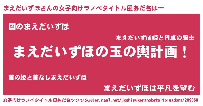 | 男性向けラノベタイトル風あだ名 | 『まえだいずほ~年齢イコール彼女いない歴の魔法使い~』 |
