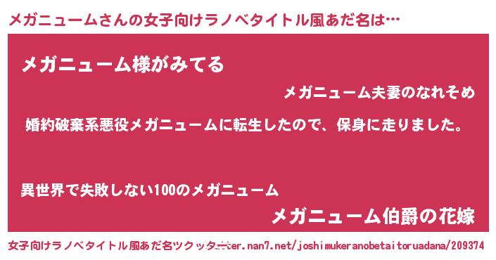 | 男性向けラノベタイトル風あだ名 | 『転生したらメガニュームだった件』 |